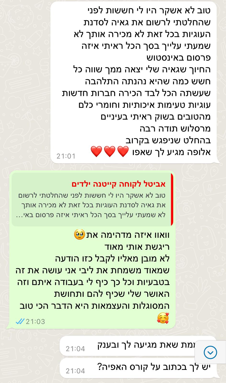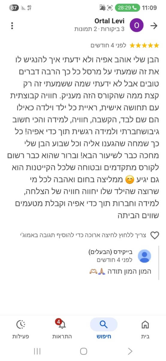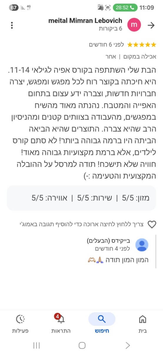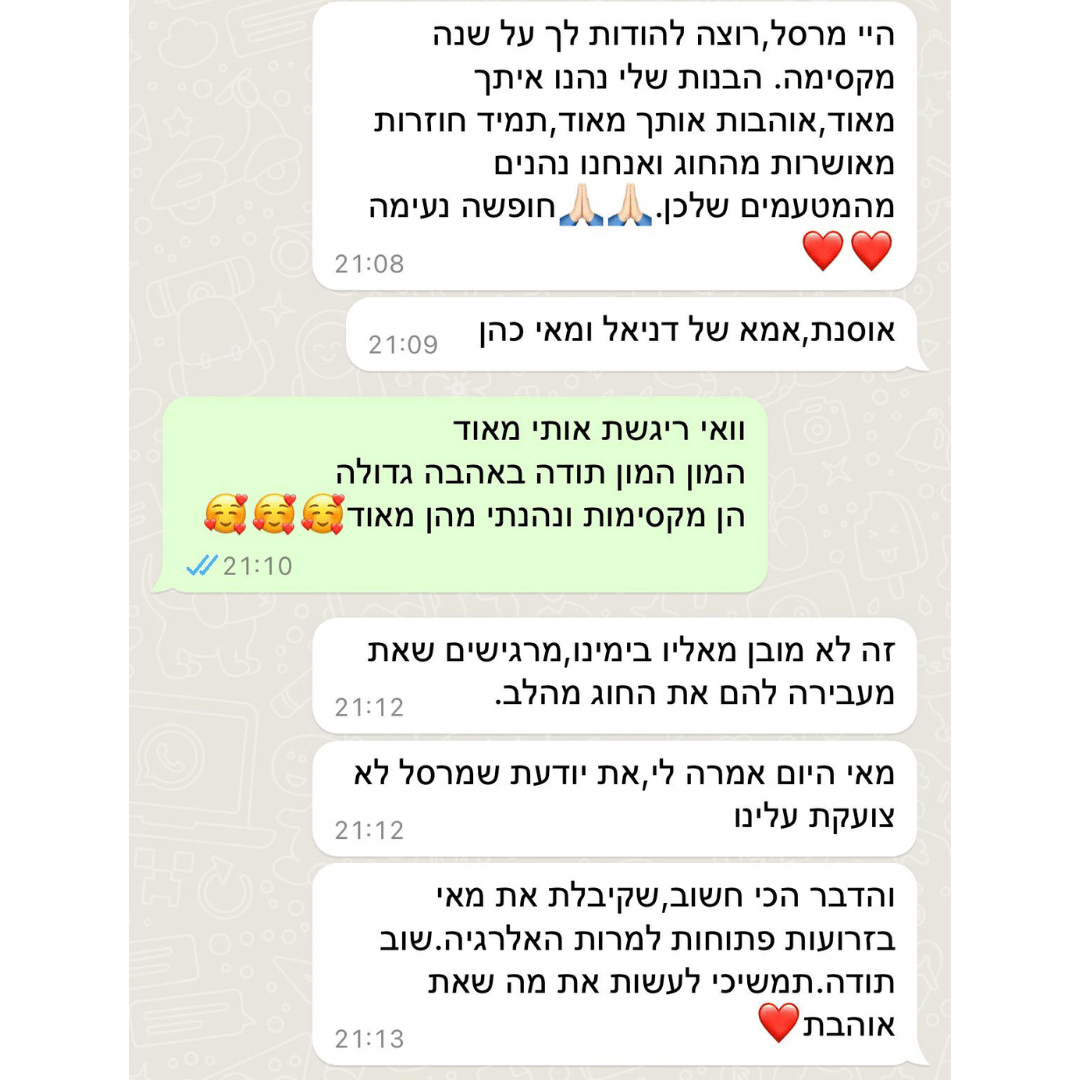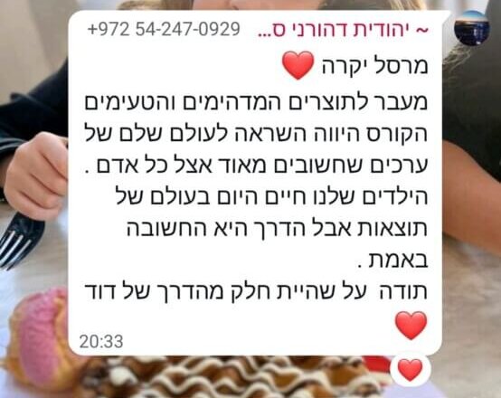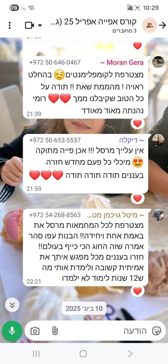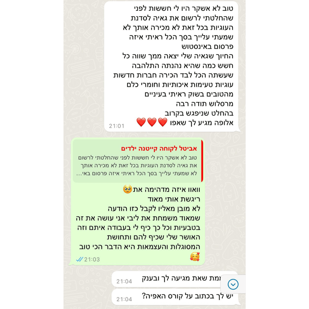 ב־12 השנים האחרונות ליוויתי מאות ילדים ונוער בעיקר בפנימיות ובתהליכים רגשיים משמעותיים. אני מאמינה שילדים זקוקים למקום שיראה אותם באמת. מקום שייתן להם להעז, להאמין בעצמם, לבנות ביטחון ולהרגיש שייכים בדיוק כמו שהם. מתוך חיבור טבעי בין הלב, המטבח והנפש פיתחתי את שיטת ההעצמה דרך אפייה. השיטה מבוססת על כל מה שצברתי בחיים: ידע מקצועי, ניסיון אמיתי ואהבה ענקית לילדים.